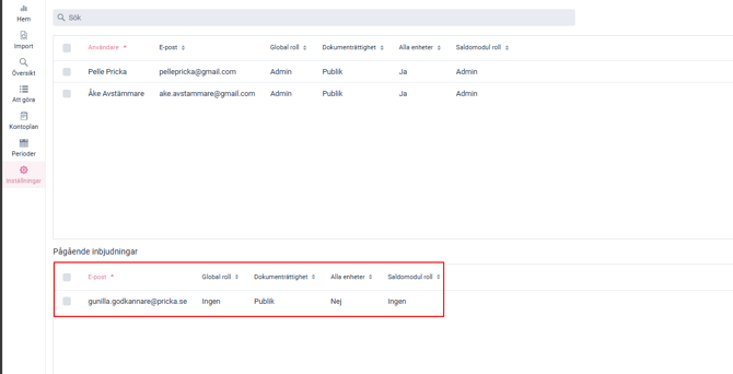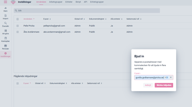 Användare bjuds in till applikationen av administratör. När en användare ska bjudas in, skickar administratören ett mejl till den angivna mejladressen. Detta mejl innehåller en inbjudan samt en länk som leder till registreringssidan. Mottagaren får då möjlighet att ange sitt namn och skapa ett lösenord.