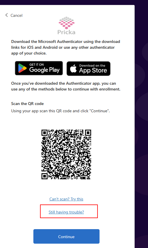 När man kommer till steget för att registrera sin MFA-app väljer man detta steg: