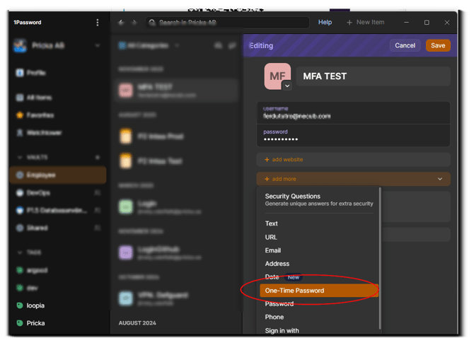 I detta exempel så lägger vi till den i 1Password genom att ange koden i One-Time Password