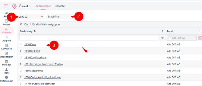 Högst upp väljer du vilken period som ska visas, t.ex. 2026-02.