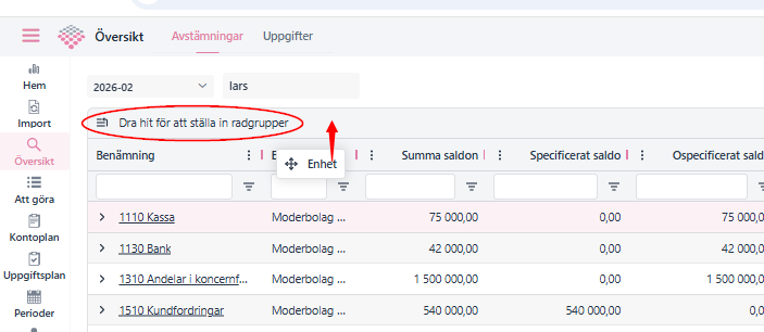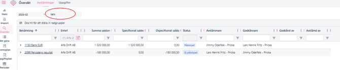 Översikten är till för att ge en detaljerad status på avstämningsgrupperna över en Period för en eller flera enheter. Den är separerad på Uppgifter och Avstämningar. Detta ger goda möjligheter att skräddarsy vyer som passar flera syften, som till exempel per bolag eller per avstämningsgrupp.