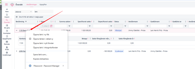 Avstämningsgruppsnamnet är klickbart, och man klicka på länken för att komma in i "specifikationsvyn". Backar man sedan i webbläsaren kommer man tillbaka till rätt ställe. Det går också bra att högerklicka på länken för att t. ex. öppna den i nytt fönster eller flik. Det går förstås bra också att kopiera länken och klistra in den i tex ett Teamsmeddelande och skicka till en kollega eller revisor.
