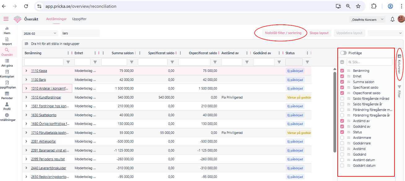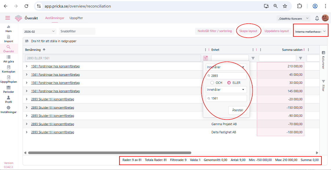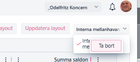 I exemplet nedan har har jag skapat en egen Layout som jag kallat "Interna mellanhavanden. Den enda filtreringen jag gjort är på "Benämning" visa 1561 & 2893 avstämningsgrupper. Sedan sparat den genom att trycka på "Skapa Layout", eller "Uppdatera layout". Så är den sparad för din användare. Layouterna är alltså "personliga".