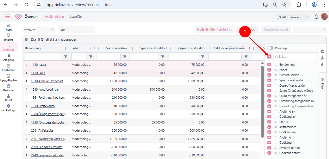 Välj de rubriker/kolumner som är intressanta för er genom att klicka på "Kolumner" om man vill ha alla kolumner bocka då i "Alla" (1):