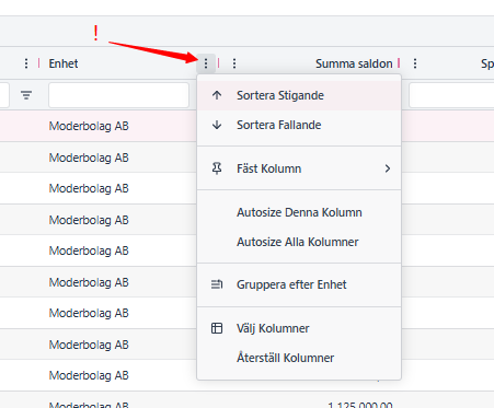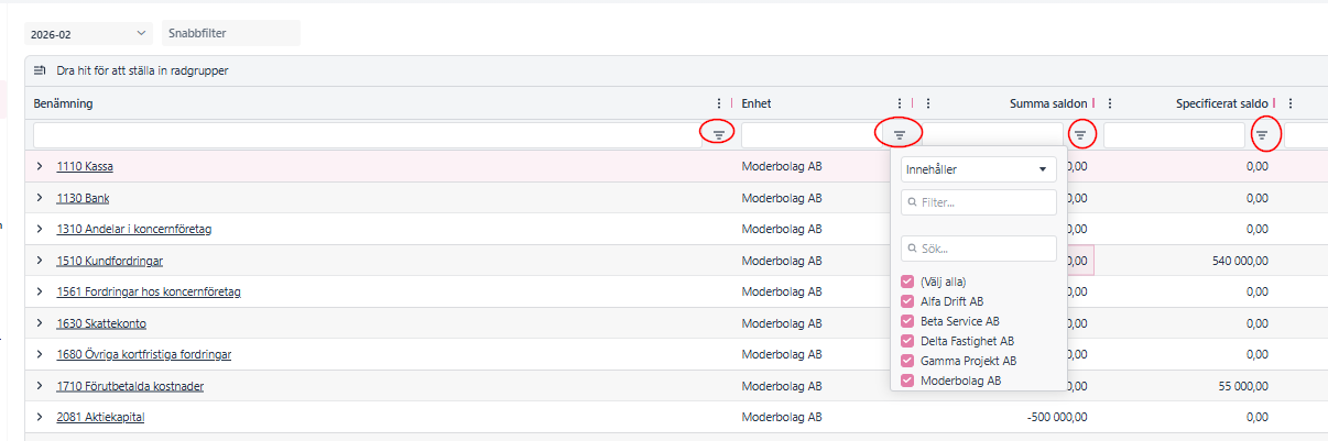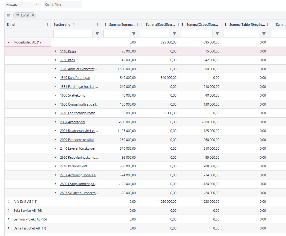 Då ser man en gruppering och summering per Enhet/Bolag som nedan: