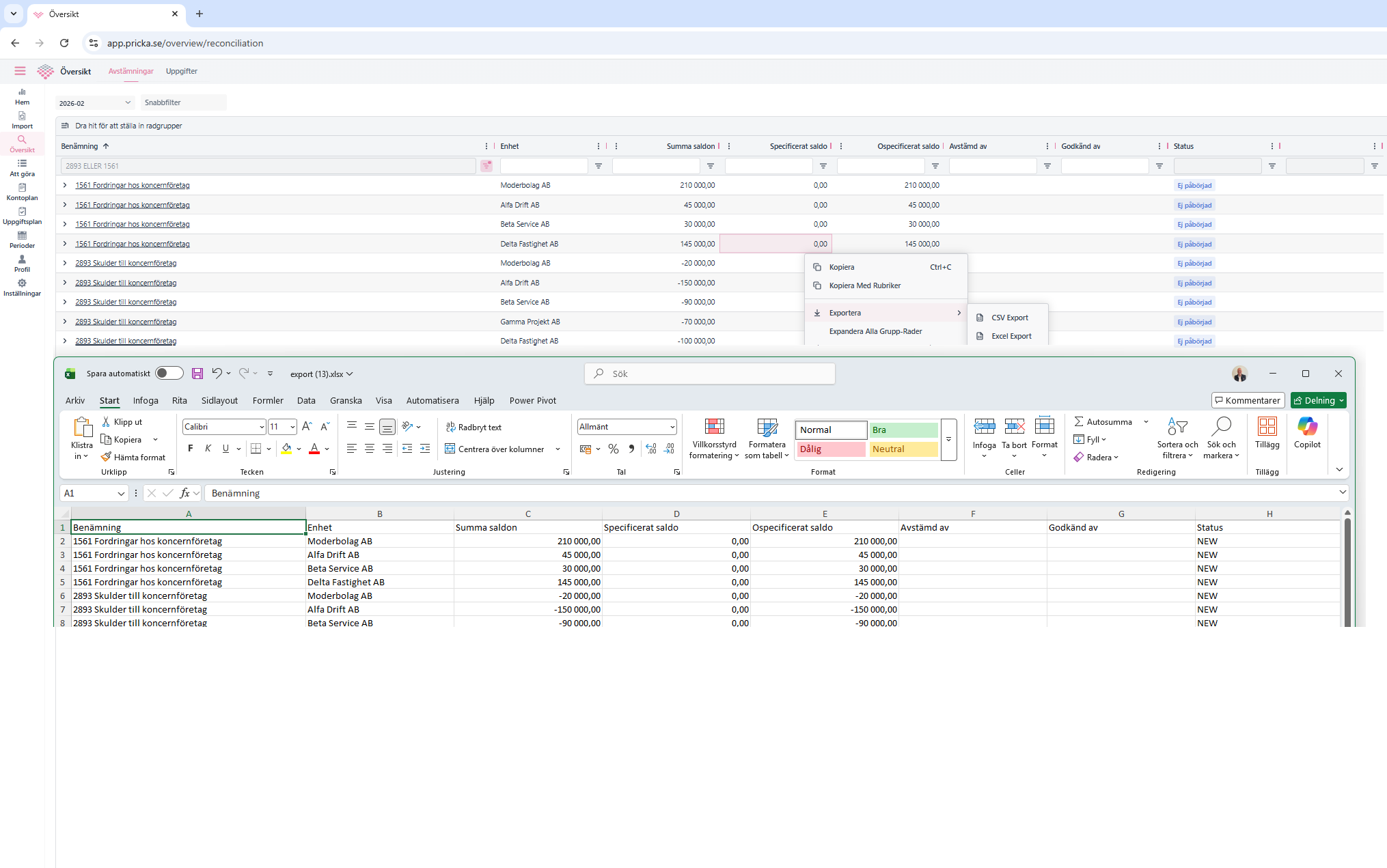 Det är enkelt att exportera vyerna. Högerklicka i något fält (förutom Benämning) och välj Exportera: